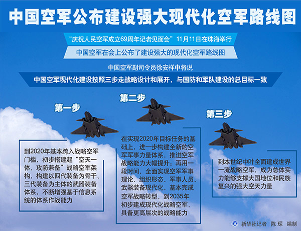 圖表:中國(guó)空軍公布建設(shè)強(qiáng)大現(xiàn)代化空軍路線圖 新華社記者 陳琛 編制