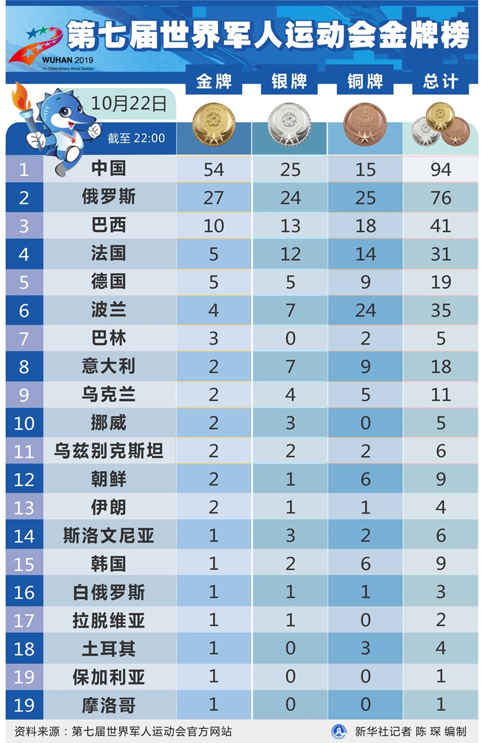 新華社武漢10月22日電(記者王恒志 廖君)中國隊22日在第七屆世界軍人運動會女排決賽中1:3不敵巴西隊,目送對手取得軍運會三連冠。雖然女排沒能贏球,但女排精神猶在,當日中國軍團各路開花,共有13金入賬,目前在金牌榜和獎牌榜均高居榜首。