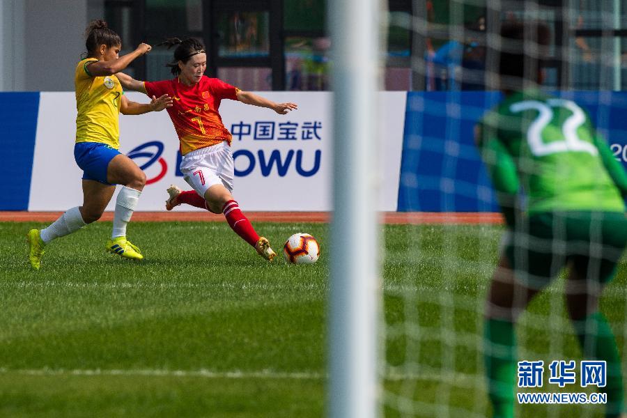 10月24日,中國隊球員劉艷秋(中)在比賽中突破傳球。 當日,在武漢舉行的第七屆世界軍人運動會女子足球半決賽中,中國隊以2比1戰勝巴西隊,晉級決賽。 新華社記者劉金海攝