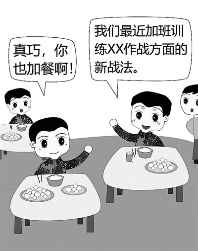 ????“真巧,你也來加餐啊。”“是啊,我們營最近在研訓新戰法,有時會加班訓練……我跟你說,我們研究的新戰法主要是××作戰方面,據說要在全旅推廣呢!”