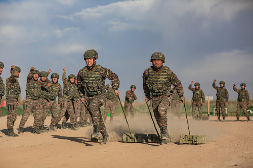 ????武警新疆總隊某機動支隊特戰一中隊組織官兵進行搬運子彈箱體能訓練(10月30日攝)。新華社發(張文 攝)