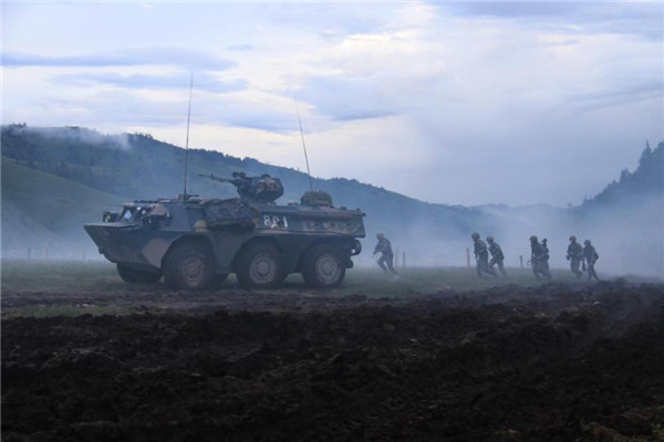????陸軍第83集團軍某旅紅一連官兵實兵利用戰車掩護向“敵”陣地發起沖鋒。新華社發(張增巖 攝)