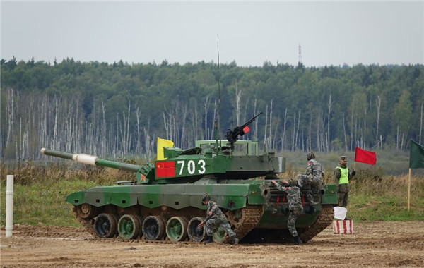 ????8月30日,中國參賽隊在俄羅斯阿拉比諾靶場參加“坦克兩項”項目單車賽。新華社記者田定宇 攝