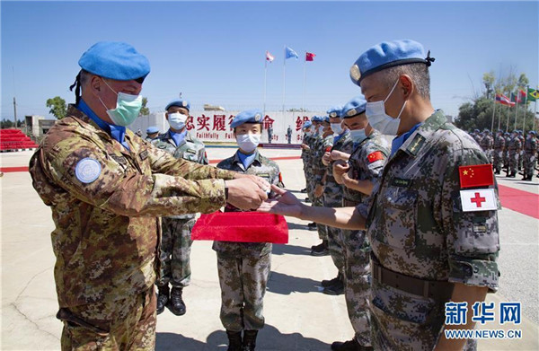 ????6月16日,中國第18批赴黎巴嫩維和部隊全體410名官兵被授予聯合國勛章,以表彰他們在任務期內為維護黎巴嫩南部地區和平與穩定做出的突出貢獻。新華社發(彭希 攝)