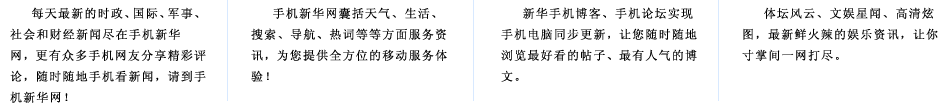 手機新華網是新華網的手機無線門戶網站,是中國最具權威的免費手機新聞網站之一。歡迎各地電信運營商以及廣告界、企業(yè)界、商務界、傳媒界等各界人士與我們聯(lián)系,精誠合作,實現(xiàn)共贏。電話:010-63070908,E-mail:xhsjb@xinhuanet.com