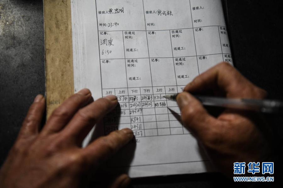 看守工廖成根在避車(chē)洞內(nèi)記錄當(dāng)天值班情況(1月30日攝)。
