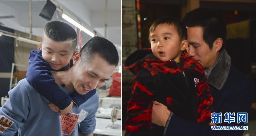 拼版照片:左圖為2021年1月26日,在福建省石獅市的金利萊斯服裝廠,聰聰和黃海龍?jiān)谝黄穑挥覉D為2018年2月2日凌晨,黃海龍即將登上返回四川的長(zhǎng)途車,在上車前抱著不滿3歲的聰聰難舍難分。