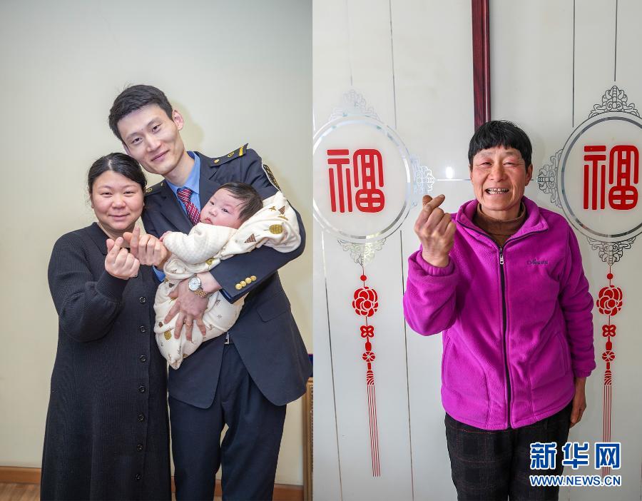 拼版照片:左圖為2月10日,在重慶市渝中區(qū)的家中,付寶印抱著兒子和妻子孫夢(mèng)潔比出心形手勢(shì)(新華社記者 黃偉 攝);右圖為2月9日,付寶印的母親鐘士輝在吉林省長(zhǎng)春市農(nóng)安縣楊樹林鄉(xiāng)牛尾巴山村家中比出心形手勢(shì)(新華社記者 張楠 攝)。
