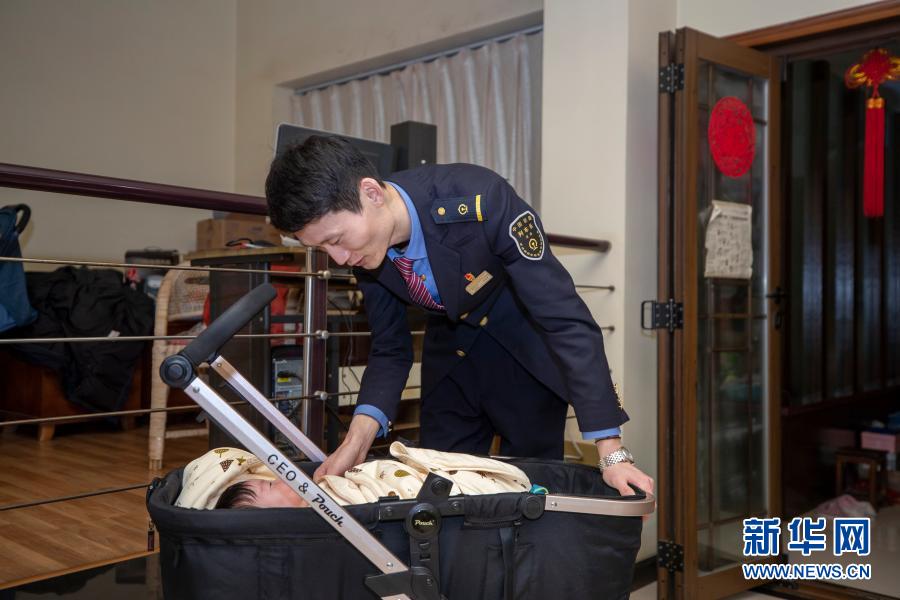 2月10日,在重慶市渝中區家中,付寶印回家后逗兒子玩耍。新華社記者 黃偉 攝