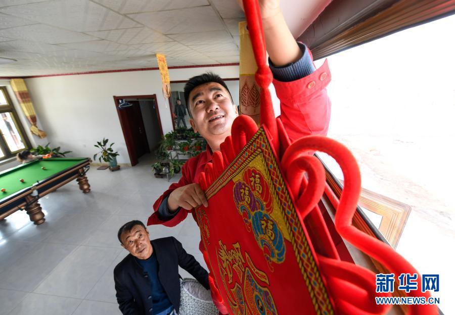 2月11日除夕當天,王濤(右)在為脫貧戶劉玉強家掛中國結(jié)。