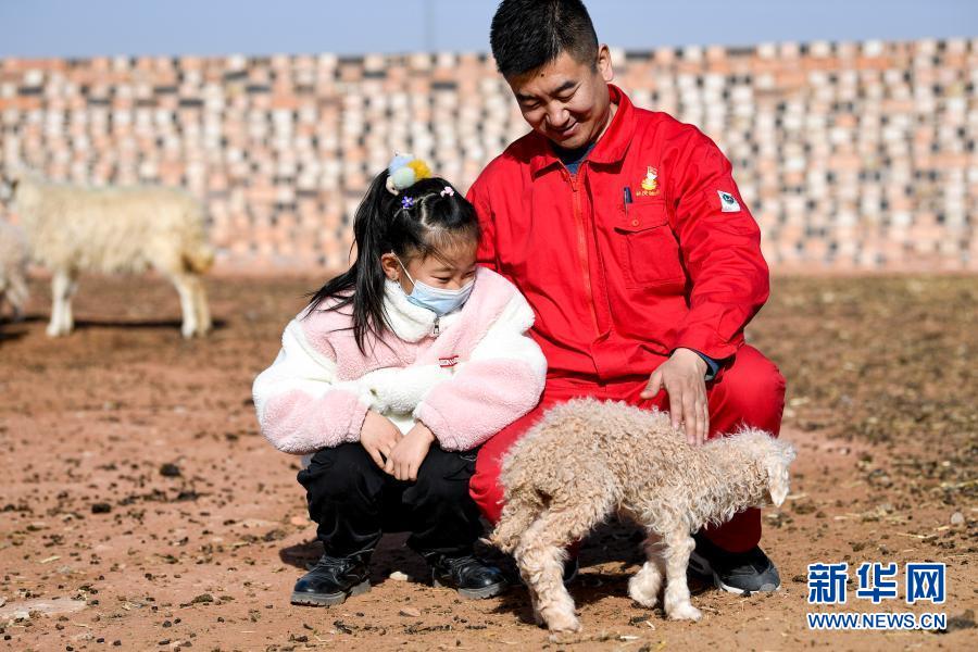 7歲的王思淇第一次來到爸爸王濤駐村的紅井子村,她對(duì)一切都充滿了好奇。這是王濤和王思淇在撫摸一只小羊羔(2月11日攝)。