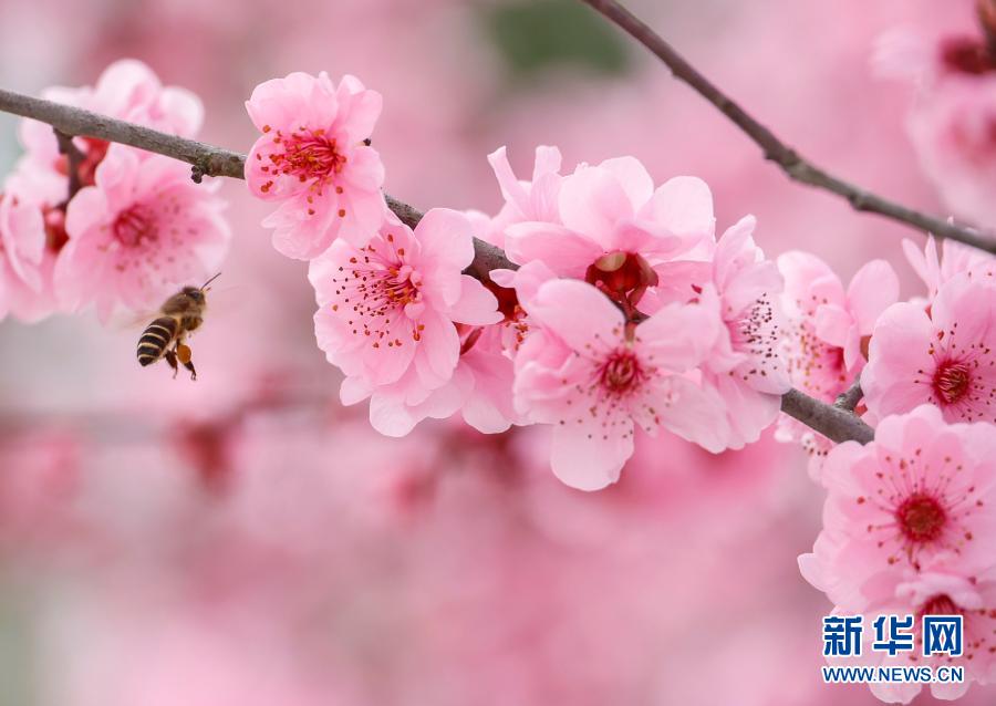 在浙江景寧畬族自治縣,蜜蜂在盛開的梅花旁飛舞(2月14日攝)。新華社發(李肅人 攝)