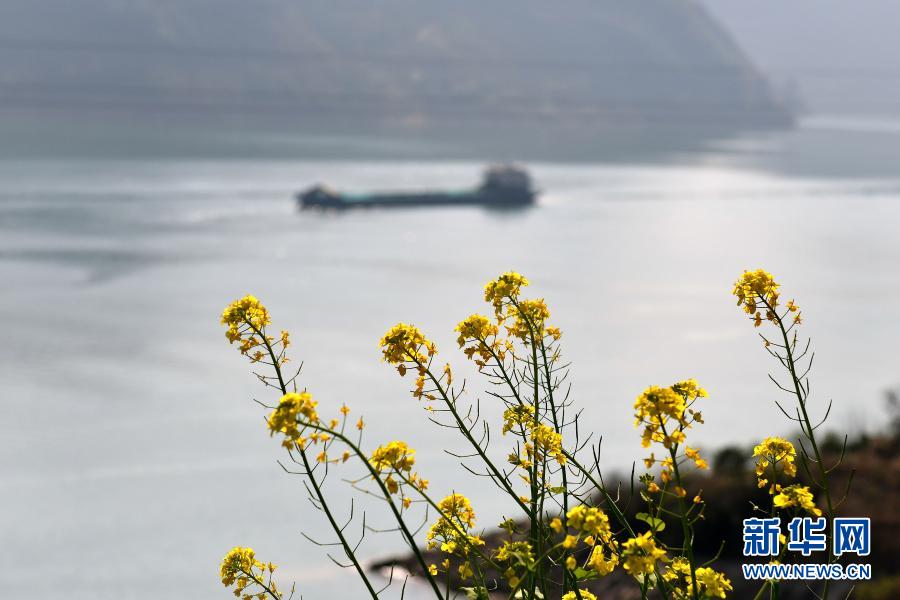 2月14日,貨輪行駛在長江湖北省秭歸縣江段,岸邊的油菜花吐露芬芳。新華社發(王輝富 攝)