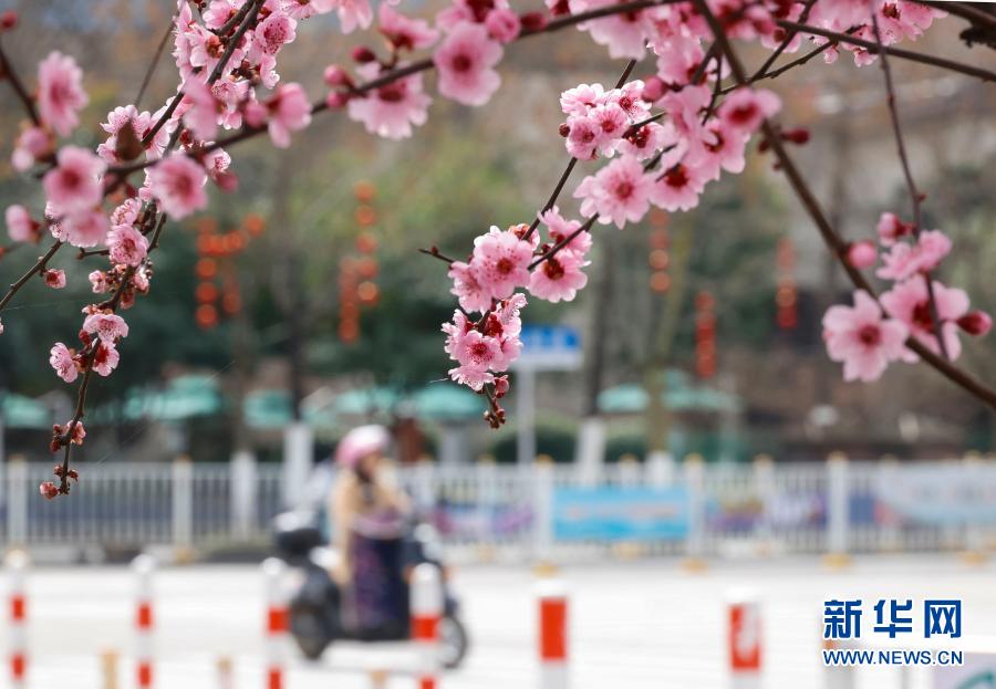 浙江景寧畬族自治縣街頭梅花盛開(2月14日攝)。新華社發(fā)(李肅人 攝)