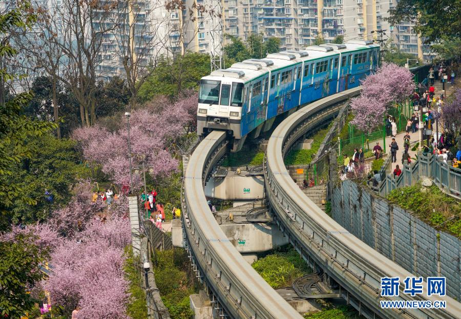 初春時節,重慶氣溫逐漸回暖,暖陽里的山城春意盎然。在重慶軌道交通2號線佛圖關段,山城步道上的梅花簇簇綻放,單軌列車穿越花海,組成一幅賞心悅目的獨特城市景觀。