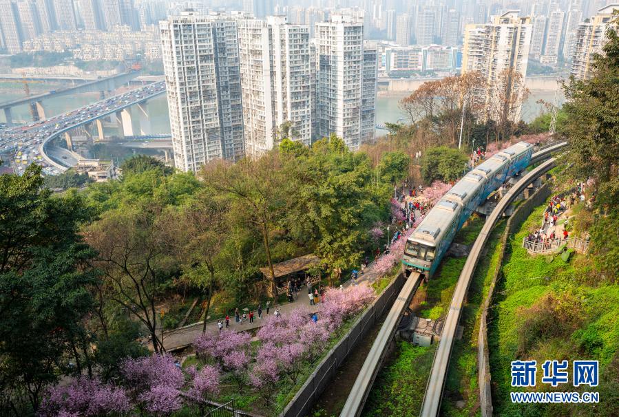 初春時節,重慶氣溫逐漸回暖,暖陽里的山城春意盎然。在重慶軌道交通2號線佛圖關段,山城步道上的梅花簇簇綻放,單軌列車穿越花海,組成一幅賞心悅目的獨特城市景觀。
