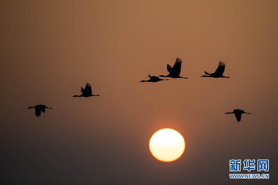 日出時分,黑頸鶴在大山包黑頸鶴國家級自然保護區(qū)飛翔(2月27日攝)。新華社記者 胡超 攝