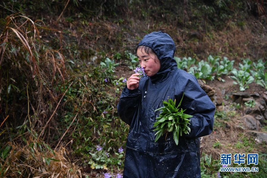 張志菊在田里勞作結束后摘了一朵野花(2月26日攝)。