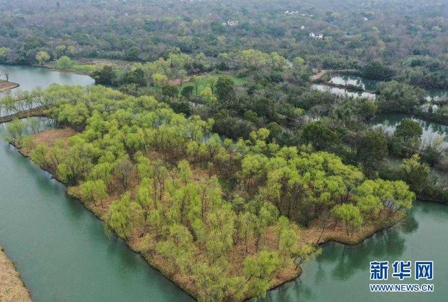 西溪濕地內(nèi)植被吐出新綠(3月2日攝,無人機照片)。