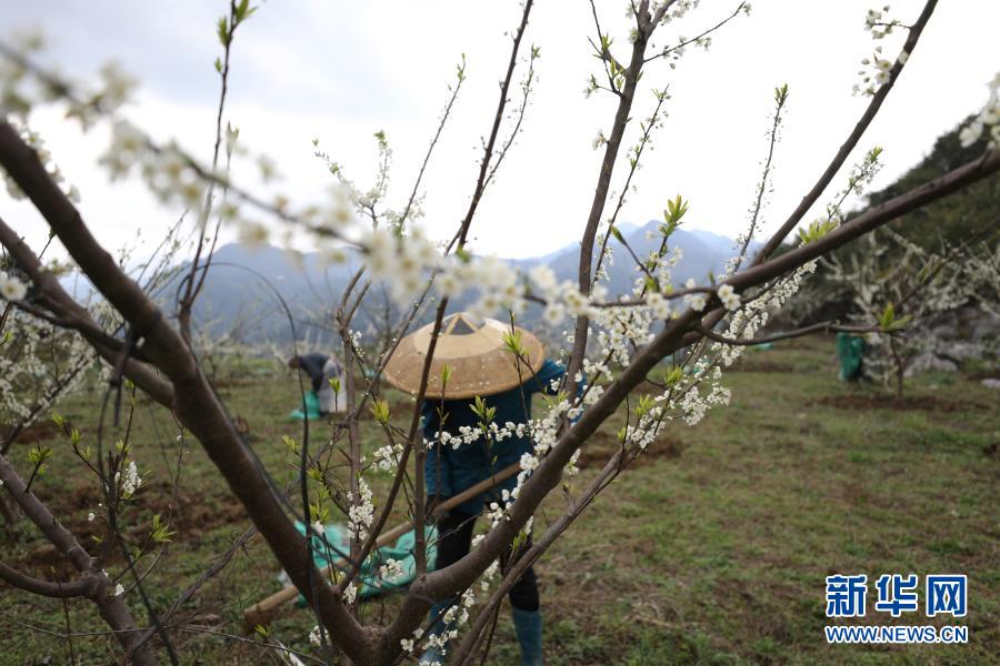 3月2日,村民在貴州省銅仁市江口縣閔孝鎮提紅村過江屯翠紅李種植基地進行春管作業。新華社發(李鶴 攝)