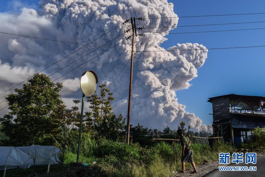 3月2日,一名男子在印度尼西亞北蘇門答臘省卡羅觀看噴發的錫納朋火山。新華社發(森比林攝)