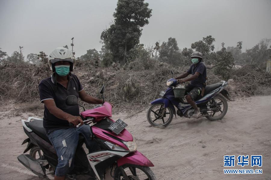 3月2日,印度尼西亞北蘇門答臘省卡羅的居民行駛在火山灰覆蓋的道路上。印度尼西亞國家抗災(zāi)署2日說,北蘇門答臘省錫納朋火山當(dāng)天上午劇烈噴發(fā),噴出的火山灰高達(dá)5000米。目前尚無人員傷亡和財產(chǎn)損失報告。