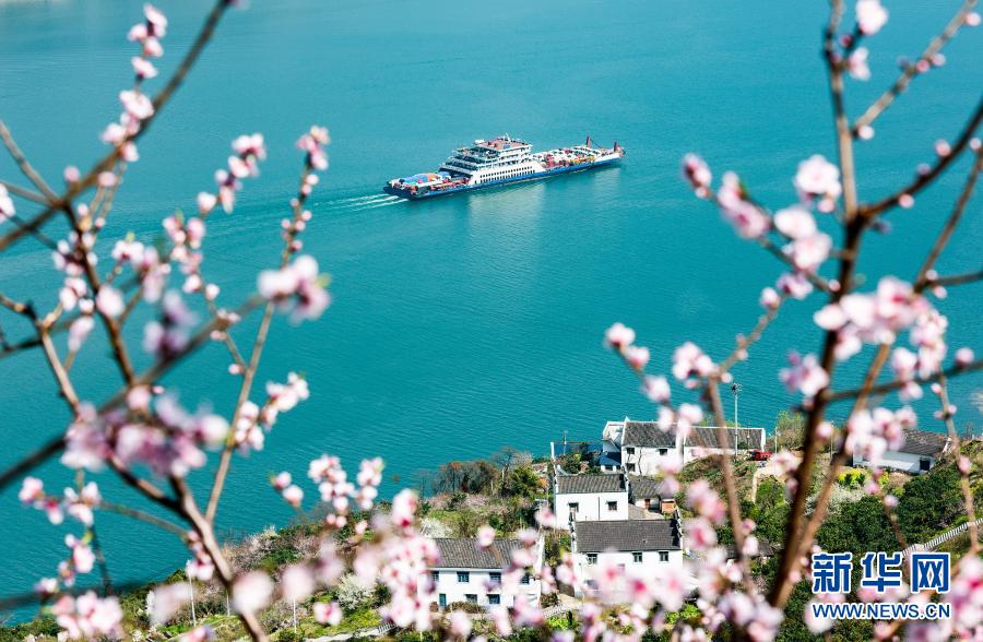 春到三峽,桃花盛開,江水碧綠,船舶往來如梭,構成一幅幅美麗的圖畫。