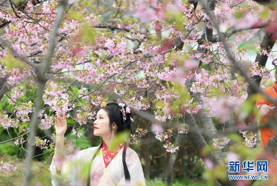 3月3日,游客身著漢服在武漢東湖櫻花園內賞花留影。