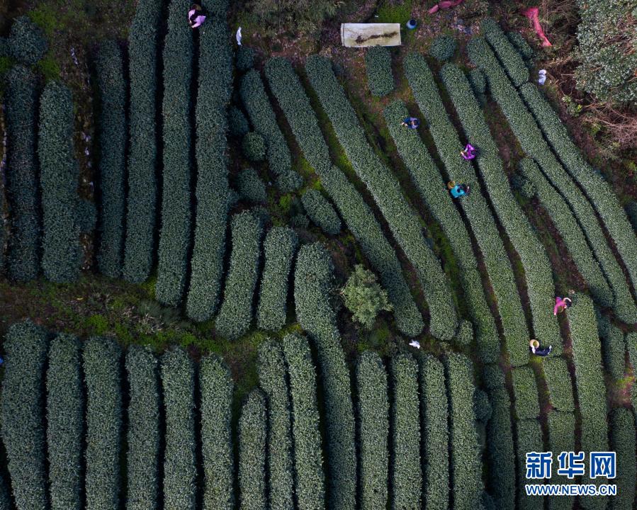 3月12日,在位于杭州市西湖風景名勝區滿覺隴村白鶴峰的西湖龍井茶葉基地,茶農在采摘西湖龍井頭茶(無人機照片)。