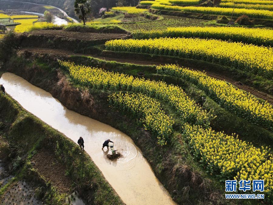 3月13日,在遵義市余慶縣白泥鎮(zhèn)民同村,村民在田間勞作(無人機照片)。新華社發(fā)(穆明飛 攝)