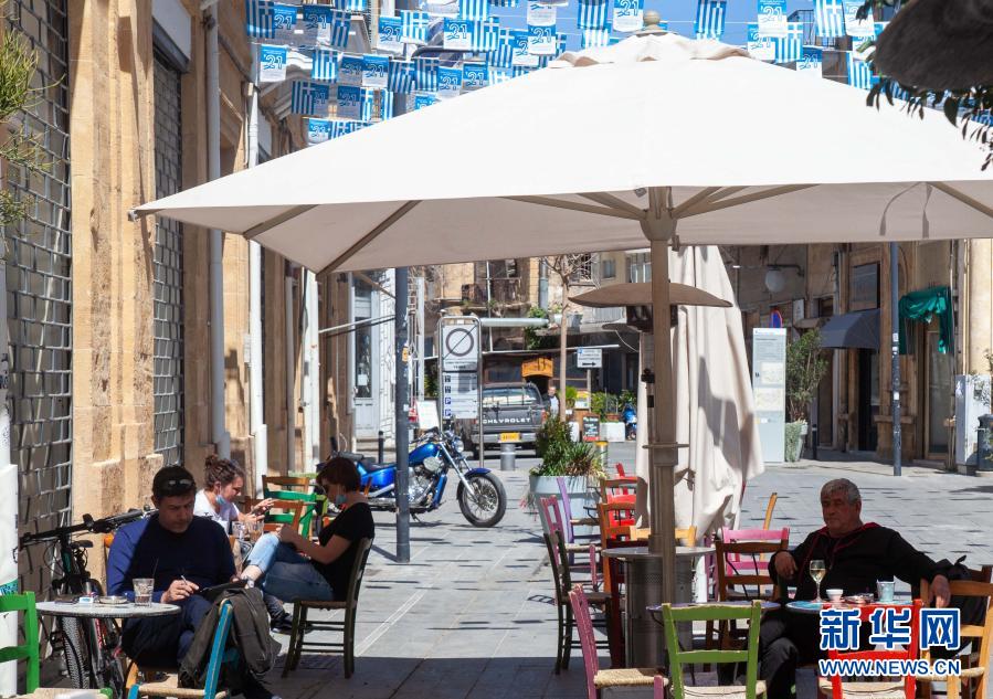 3月16日,人們坐在塞浦路斯首都尼科西亞一家咖啡館的室外區域。