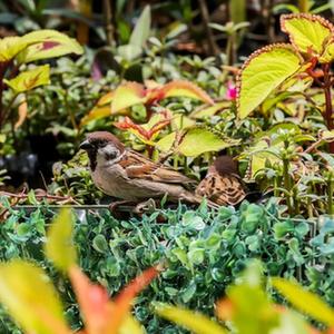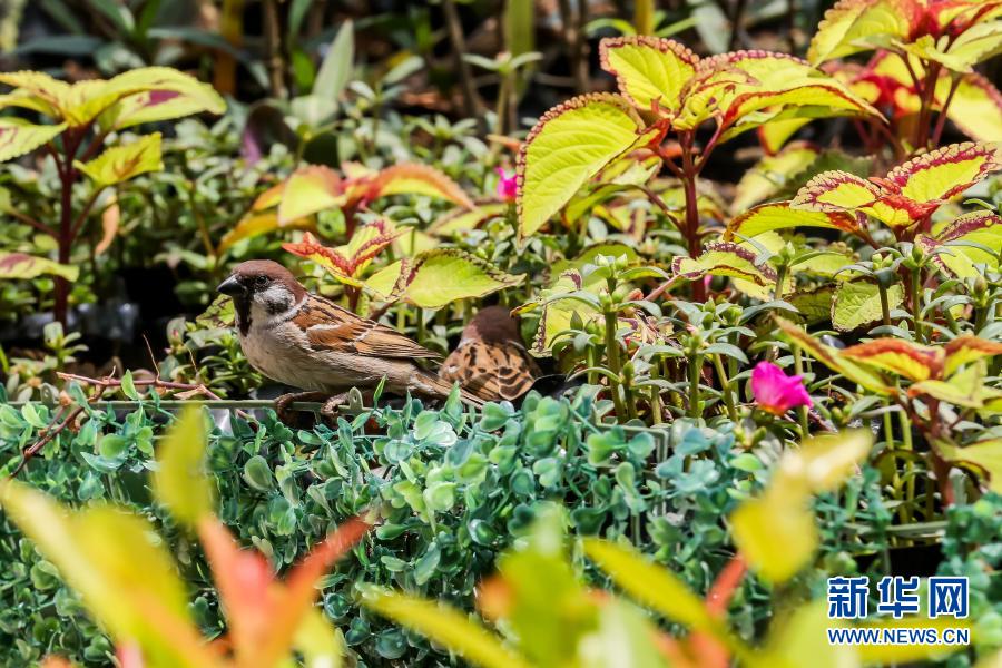 3月18日,在位于馬尼拉的菲律賓大學附屬菲律賓總醫院,兩只麻雀站在“低語的花床”藝術裝置上。