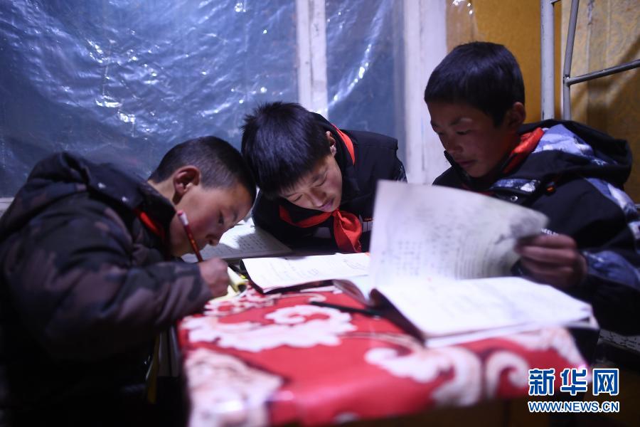 3月16日,在索加鄉寄宿小學,羅松東丁(中)和小伙伴在宿舍內溫習功課。新華社記者 張宏祥 攝