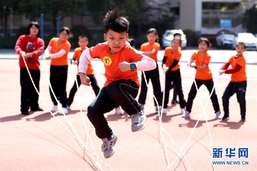 3月23日,在合肥市大通路小學新海校區,學生在大課間練習花樣跳繩。
