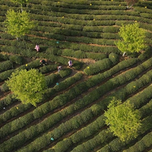 3月24日,茶農(nóng)在黃山毛峰唐模標準化生態(tài)茶園里采茶(無人機照片)。