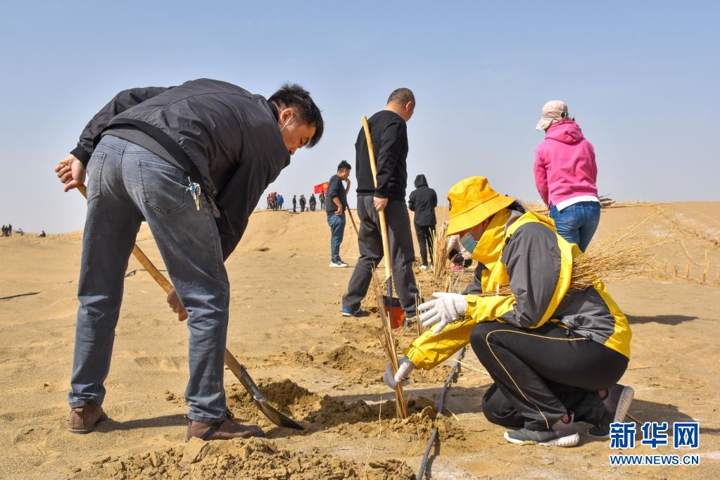 隨著天氣逐漸轉暖,在地處塔克拉瑪干沙漠南緣的新疆且末縣,人們紛紛行動起來植樹防沙,為沙漠增添綠色。