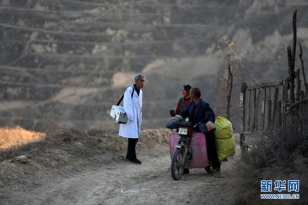 在山西省石樓縣鐵頭村張家灣自然村,張尚保(左)和村民聊天(3月23日攝)。新華社發(劉亮亮 攝)