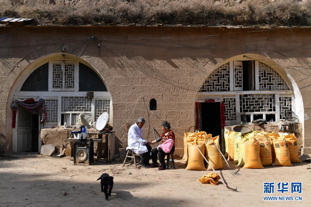 在山西省石樓縣鐵頭村寺山自然村,張尚保在為村民測(cè)量血壓(3月24日攝)。新華社記者 詹彥 攝