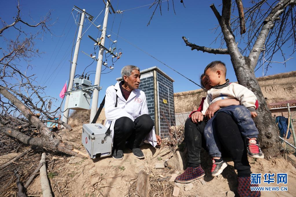 在山西省石樓縣鐵頭村巴福山自然村,張尚保(左)詢問村民的身體情況(3月23日攝)。新華社記者 詹彥 攝