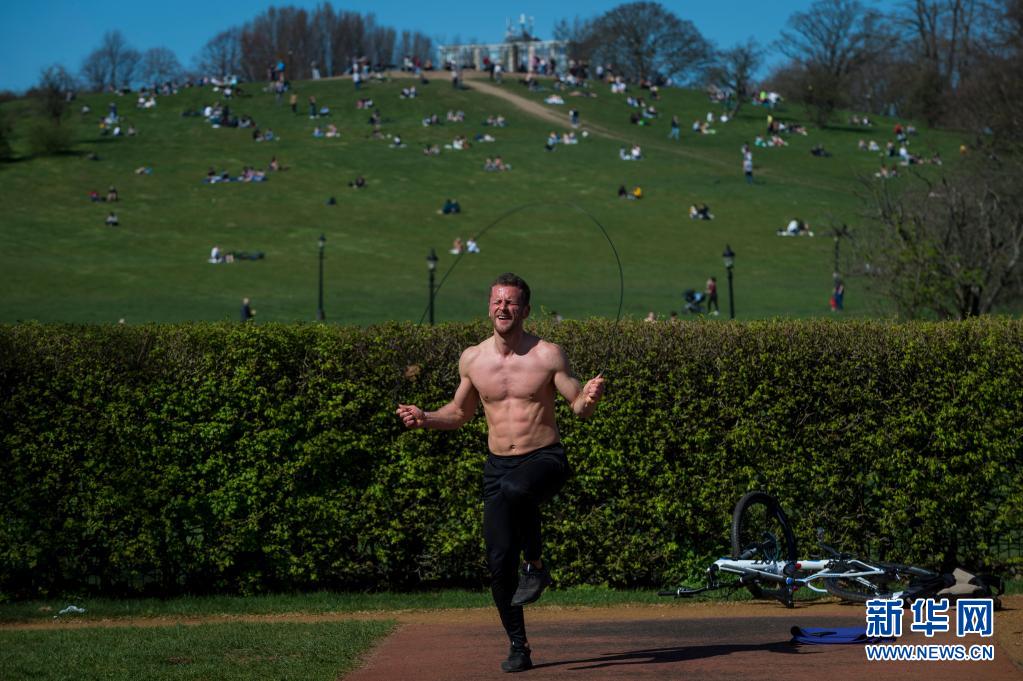 3月29日,一名男子在英國(guó)倫敦報(bào)春花山的戶(hù)外健身區(qū)域鍛煉。
