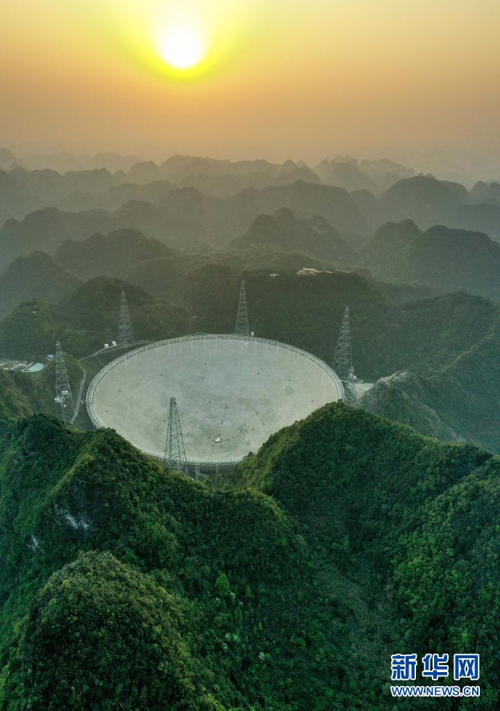 3月29日拍攝的晚霞中的“中國天眼”全景(維護保養期間拍攝,無人機照片)。
