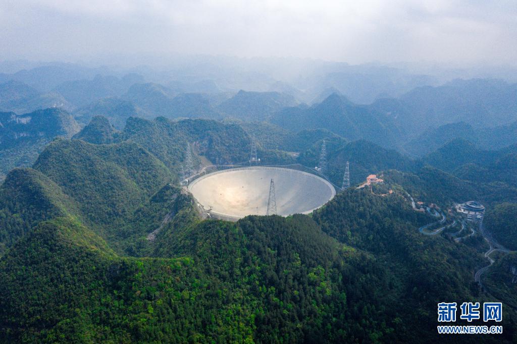 在貴州省平塘縣,被譽為“中國天眼”的500米口徑球面射電望遠鏡(FAST)在群山中仰望星空,探求著宇宙奧秘。