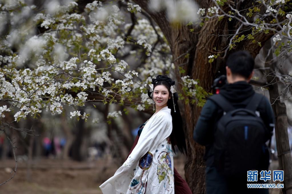 4月3日,游客在中衛(wèi)市南長灘村梨花園內(nèi)拍照留影。
