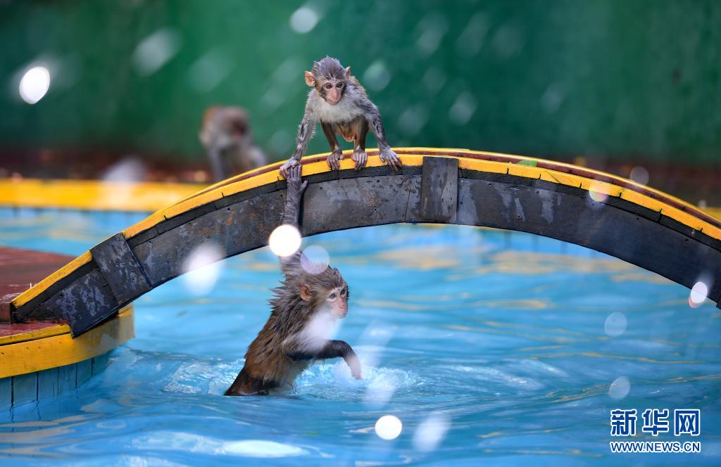 4月4日,獼猴在南灣猴島保護區里戲水。