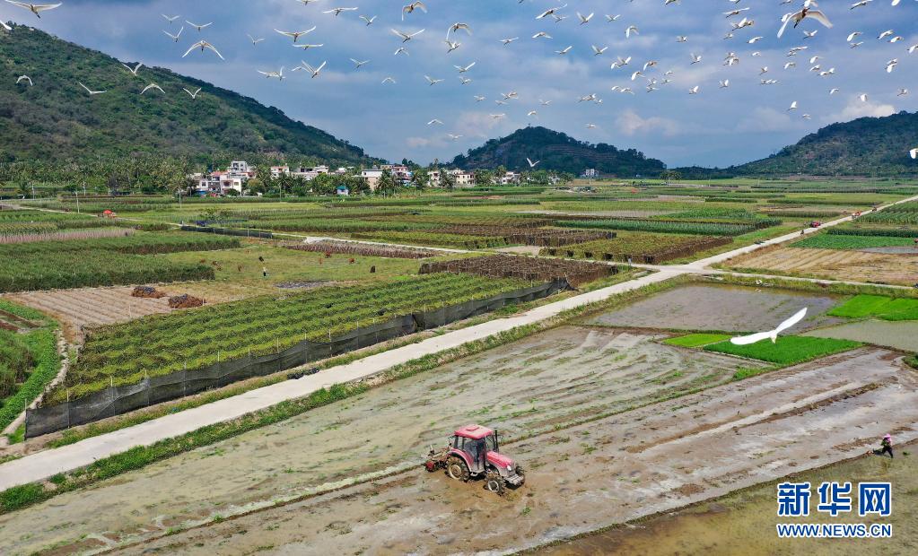 4月5日,海南省陵水黎族自治縣光坡鎮的農民在田間勞作(無人機照片)。