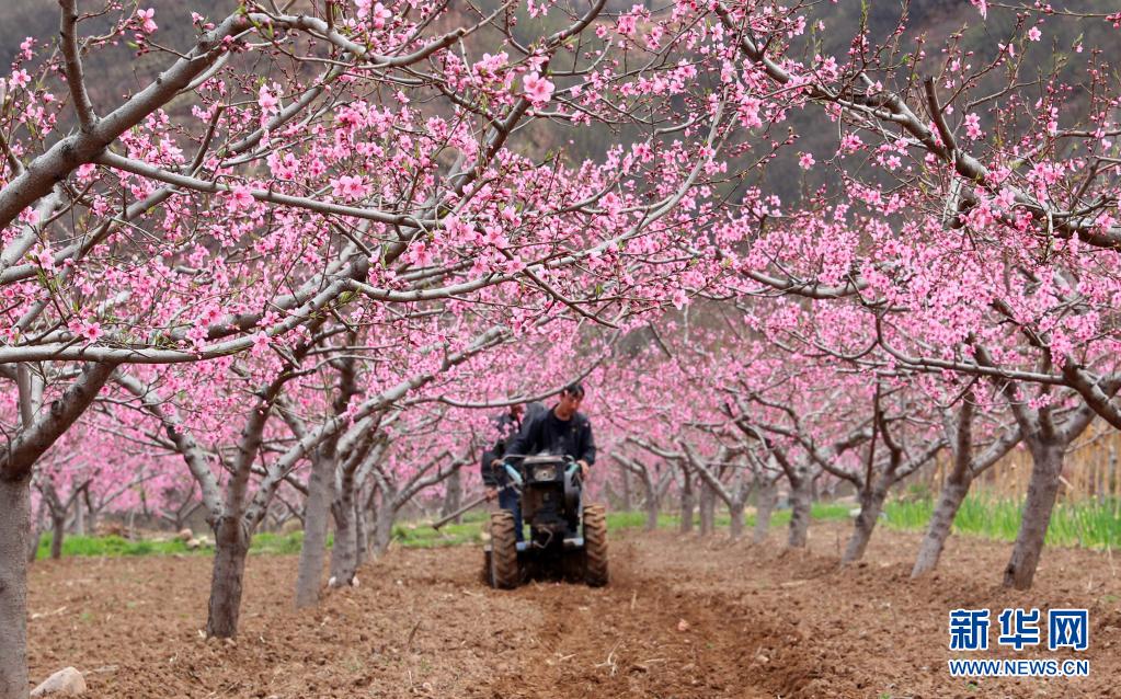4月5日,河北省石家莊市井陘縣測魚鎮楊莊村村民駕駛農機在桃園里作業。