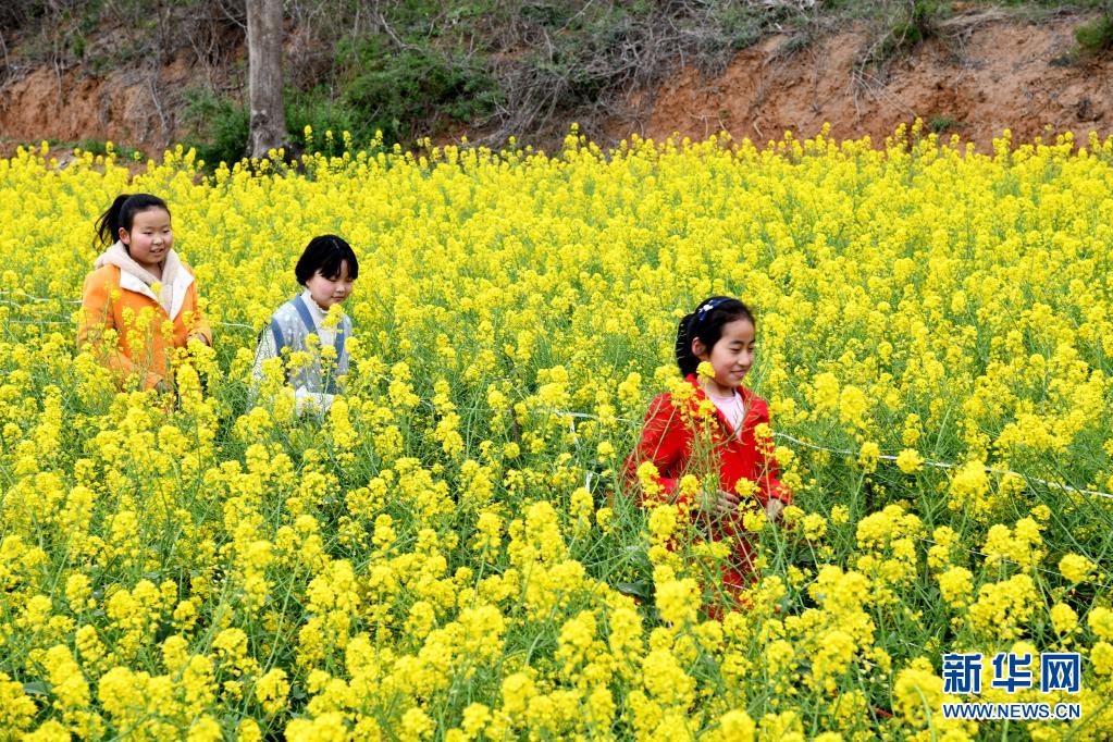 4月5日,孩子們在河南省濟源市坡頭鎮狄溝村田間賞花。