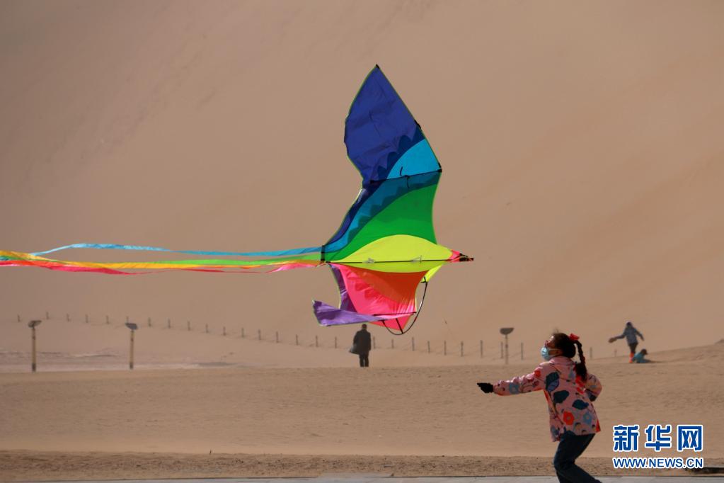 4月5日,小朋友在甘肅省敦煌市鳴沙山月牙泉景區(qū)山門廣場放風(fēng)箏。
