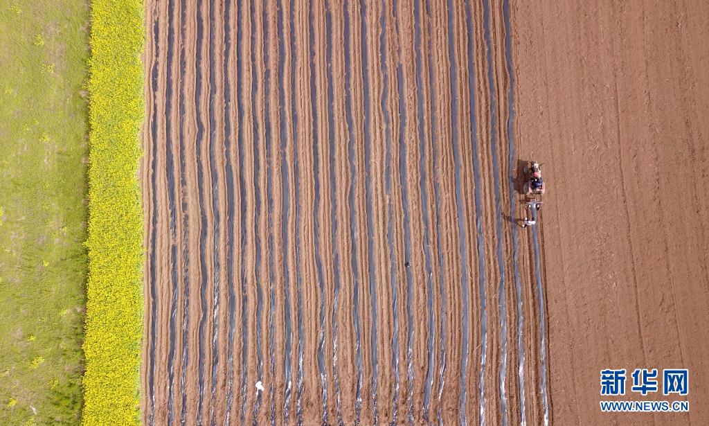 4月6日,在河南省洛陽市汝陽縣蔡店鄉孟腦村,農民駕駛拖拉機在辣椒地里覆蓋地膜,為及時移栽辣椒做好準備工作(無人機照片)。