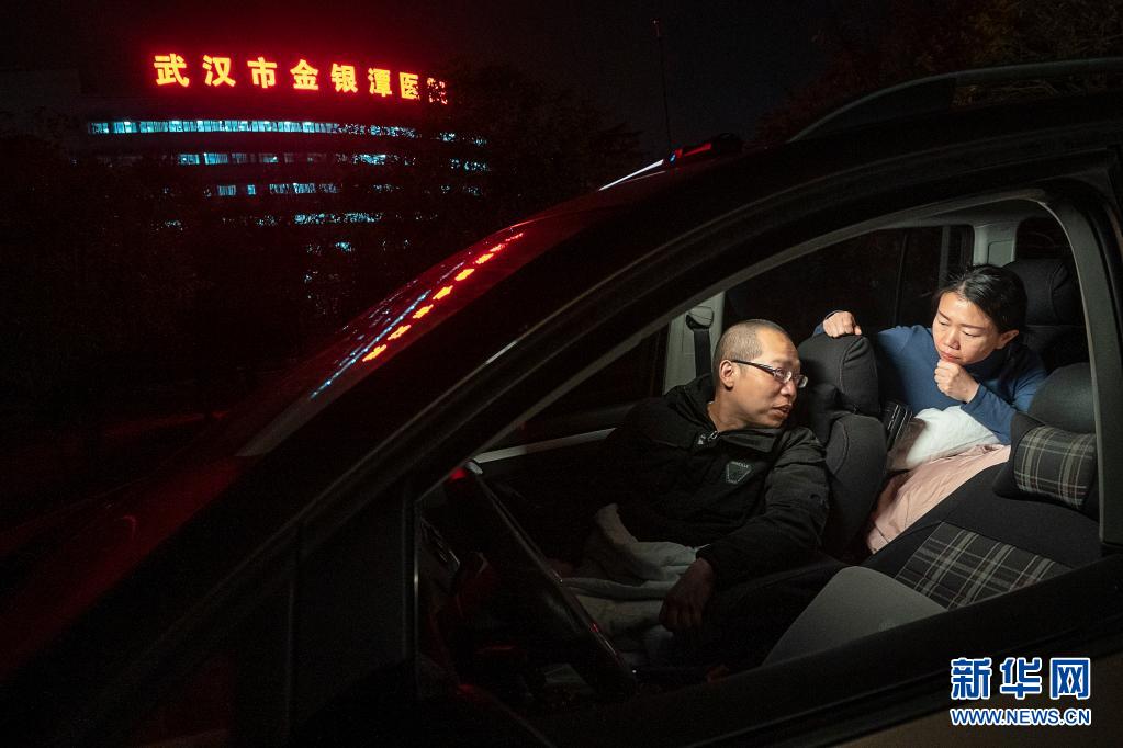 2020年2月22日晚,武漢市金銀潭醫院的醫護夫妻涂盛錦(左)與曹珊在車內聊天。從大年初一開始,兩人就住進車里,為在疫情中搶救病患,爭分奪秒,以車為家。新華社記者 熊琦 攝